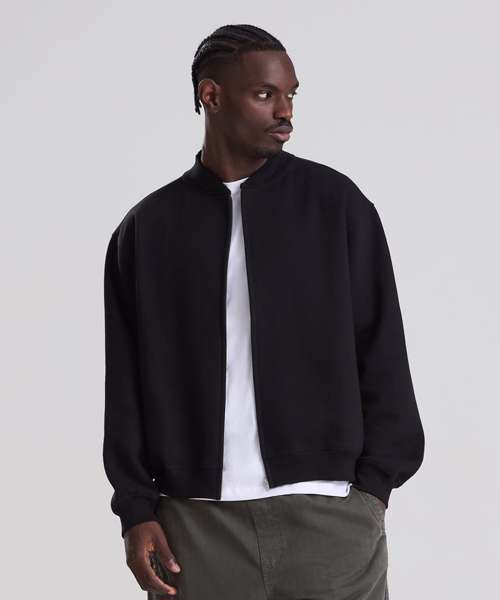 The Signature heavyweight bomber sweat is designed with a modern oversized fit and boxy unisex shape. Built from 100% cotton-faced fabric for sharp prints, with a brushed inner fleece for warmth, it blends comfort with a premium finish. Details include a YKK silver zip, 2x1 ribbed collar, ribbed cuffs and hem, plus features such as a locker patch for rebranding and a practical hanging loop. Completed with a size label only, it’s the perfect base for branding. Made with recycled polyester.