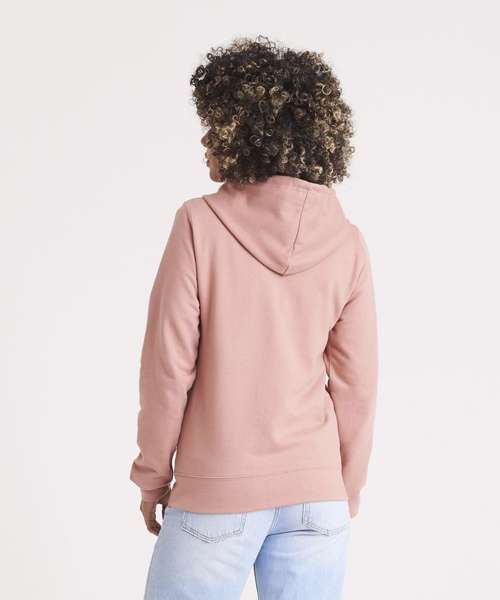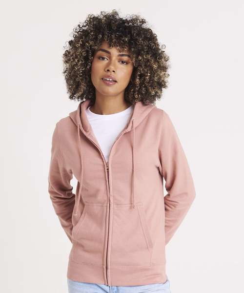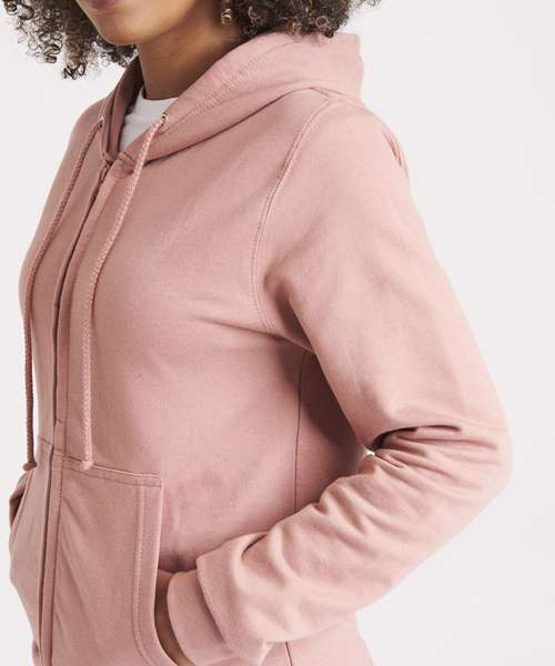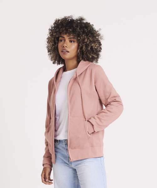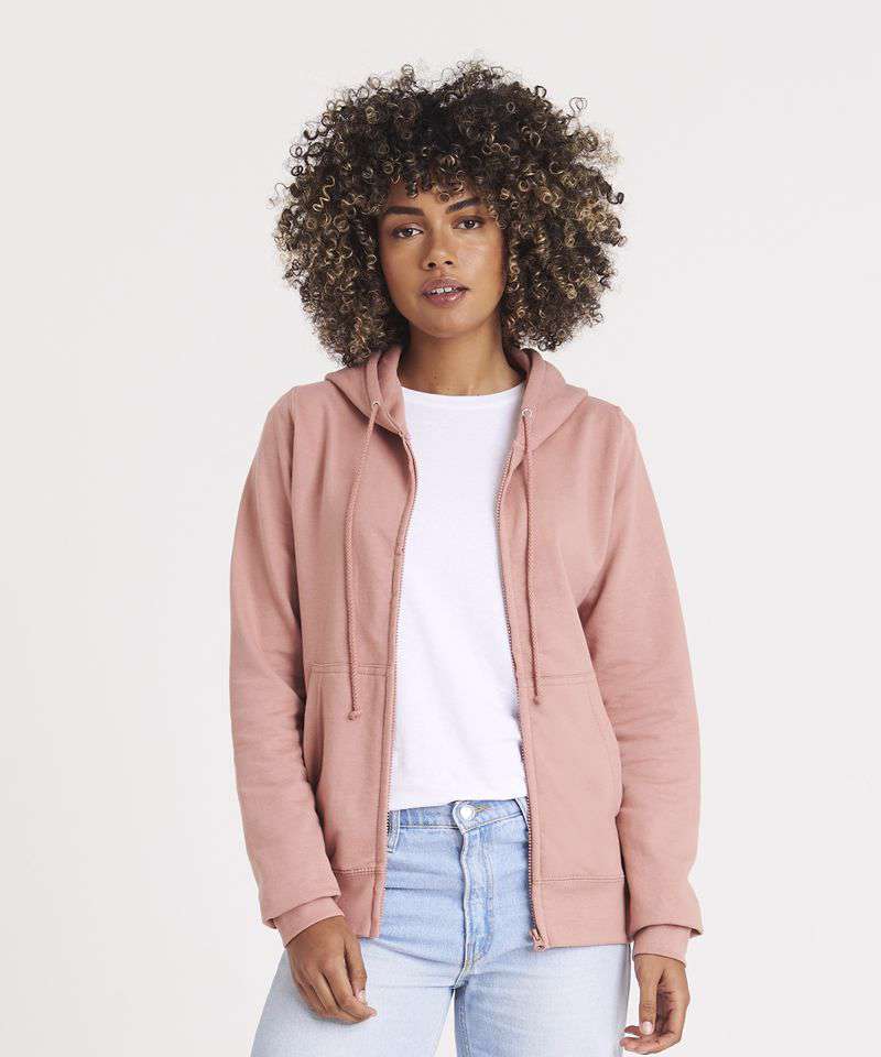 Full-zip zoodie. Women’s relaxed fit. Covered main plastic YKK zip. Twin-needle stitching detail. Double-fabric hood. Self-coloured drawcords. Kangaroo pouch pockets. Simple tear-out label makes it perfect for rebranding. Brushed inner fleece. Ribbed cuffs and hem. Soft cotton-faced fabric creates the ideal printing surface.