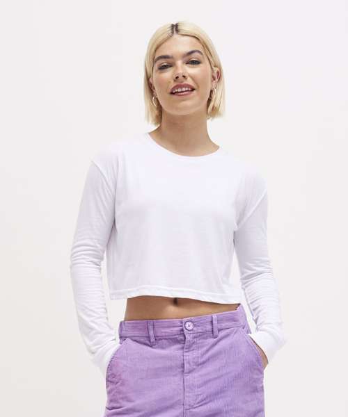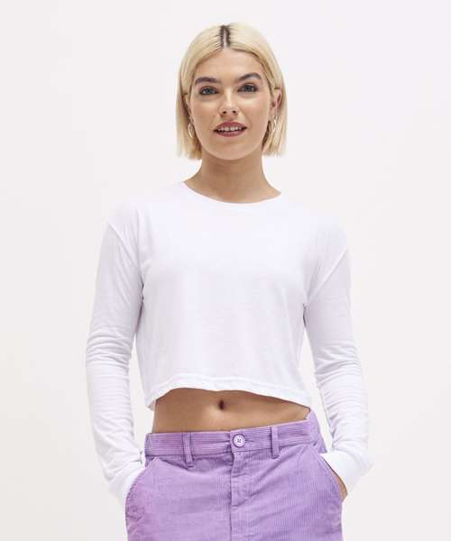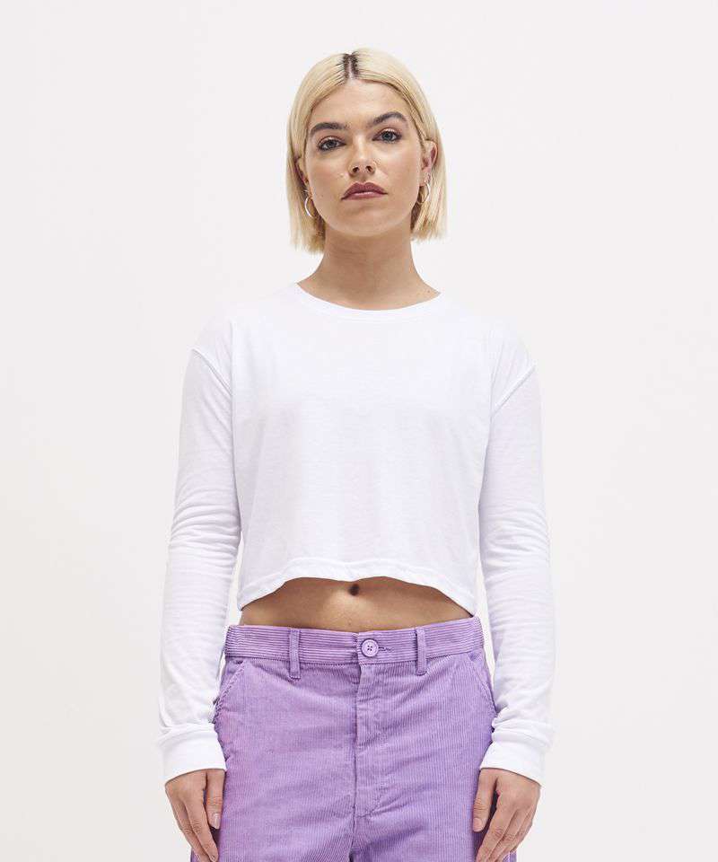 Easy-to-wear long sleeve cropped t-shirt, great for layering. Pair with jeans for an on-trend look. Soft to the touch, due to its fabric mix, and featuring a classic crew neckline. A wardrobe essential.