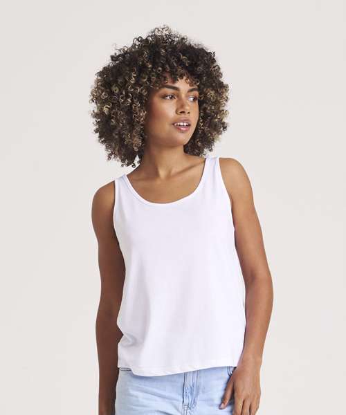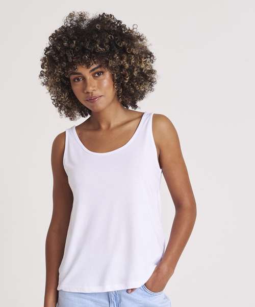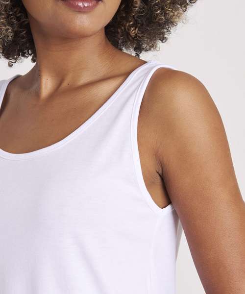Relaxed fit. Side seams (non-tubular). Size label only, for easy rebranding – colour coded white for women. Triblend fabric for style and comfort. Surface excellent for print or embroidery. Self-fabric binding around neckline and armhole. Twin-needle stitching detail on sleeve and bottom hem.