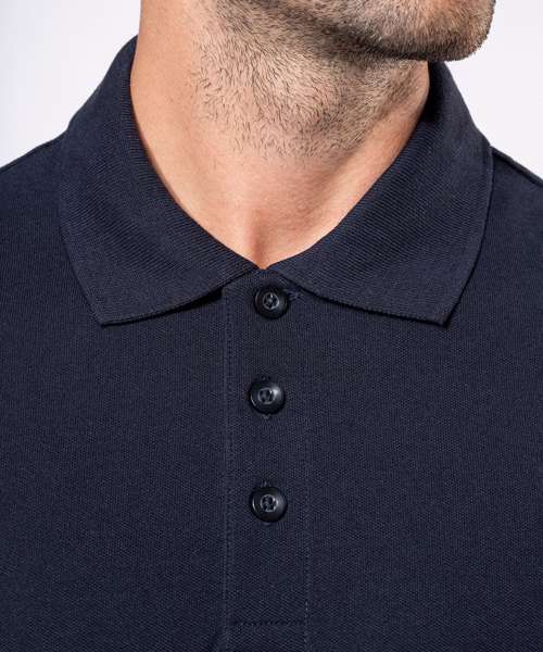 65% Polyester 35% Cotton, Piqué Knit. Ribbed collar. 3-button placket. Contrast panels down arm and body sides. Hemmed sleeves. Side vents. Twin needle finishing. BSCI certified. Oeko-Tex certified. SEDEX certified. WRAP certified.