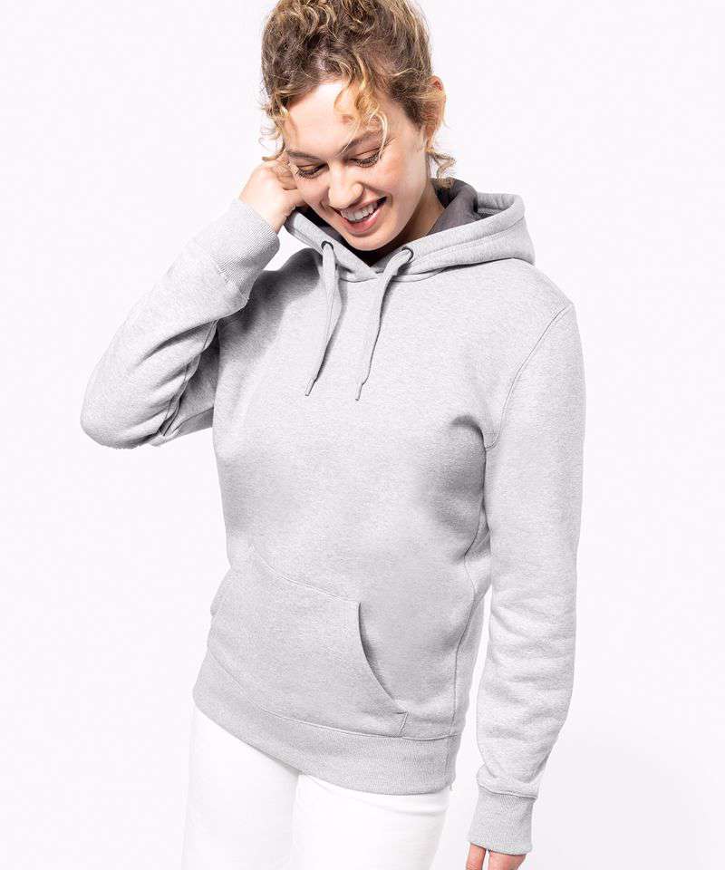 80% Combed cotton / 20% Polyester. Low shrinkage brushed fleece. Silicone wash. Heather Grey contrast reinforced neck tape and inner hood for all colours, except for Oxford Grey body where reinforced neck tape and inner hood are Dark Grey. Set-in sleeves. Front kangaroo pouch pocket. Ribbed cuffs and waistband. BSCI certified. Oeko-Tex certified. WRAP certified.