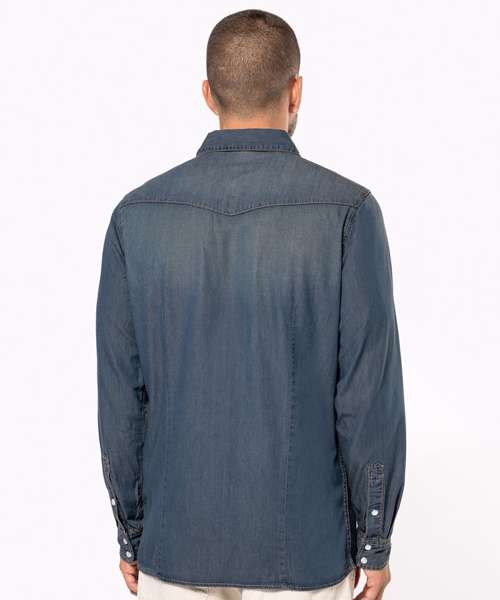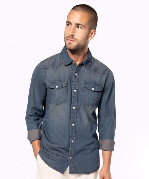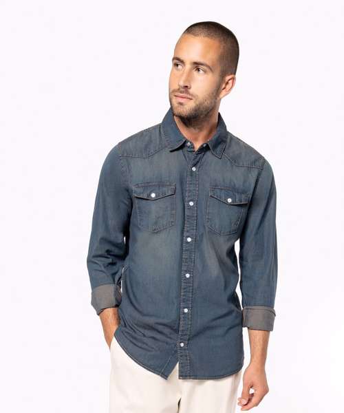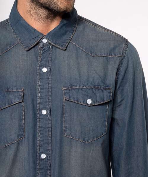 100% cotton. Enzyme-washed shirt. Fitted style. Decorative stud buttons. 2 studded chest pockets with flap. Front and back yokes. Studded cuffs. This product has been specially treated and appears intentionally aged. This manufacturing process results in colour variations between products and makes each piece unique.