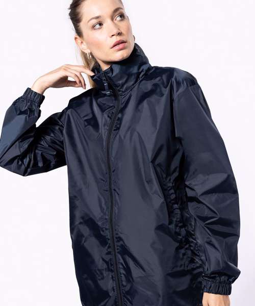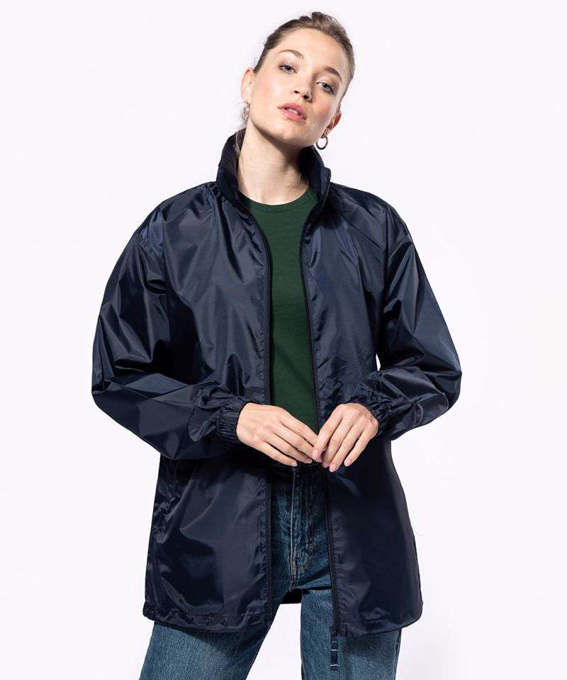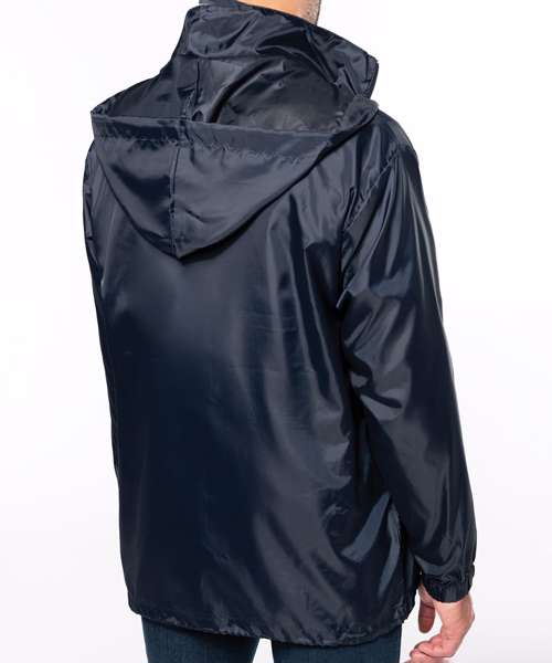 100% polyester. Concealed hood with tear release fastening tab. 2 front zipped pockets. Drawstring at bottom. Elasticated cuffs. Packs/zips into front pocket. Full front zip. BSCI certified. SEDEX certified.