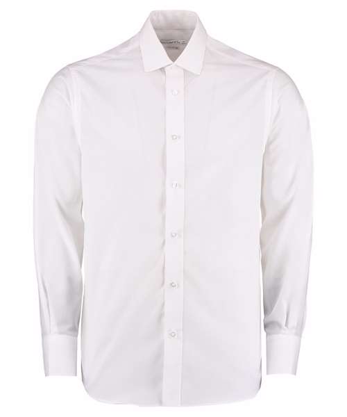 Fused stand-up semi cutaway collar with removable collar bones. Easy-iron. Two button cuffs. Double-stitched side and sleeve seams. Spare button. Kustom Kit® woven back neck label. Single-stitched yoke and armholes. Rounded hem.