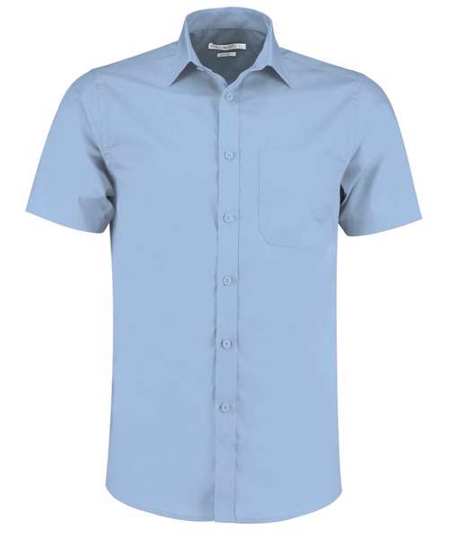 Fused semi cutaway collar. 7-button placket with self-coloured buttons. Rounded hem. back yoke. Single stitching around armholes. Double-stitched sleeves and side seams. Patch pocket with angled corners to left chest as worn. Spare button. Kustom Kit® woven back neck label.
