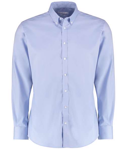 Fused stand-up button down collar. Two darts at back. Rounded hem. Back yoke. Two button cuff with buttoned cuff placket. Single stitched yoke and armhole. Spare buttons. Kustom Kit® woven back neck label.