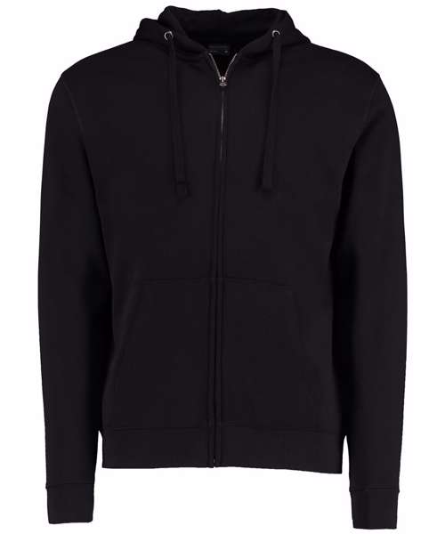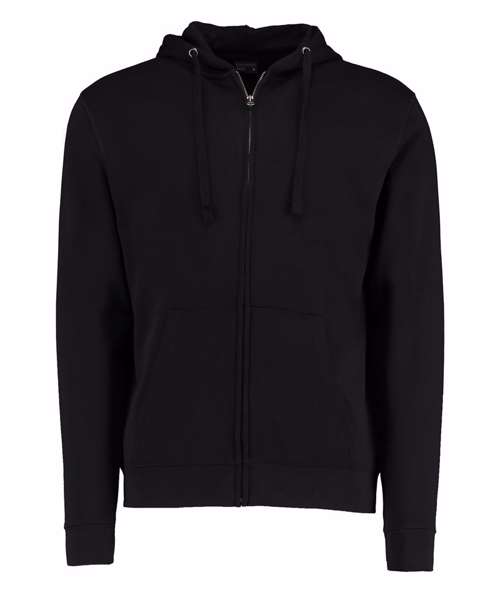Full front zip. Self fabric lined hood. Self coloured tape to back neck, taped shoulders. Self fabric double layered cuff and welt. Double-stitched shoulders, flat lock feature seaming around armhole and top of pocket. Flat tape cord through hood, channel finished with metal eyelets. Brushed silver metal hardware. Double pocket to centre front. Kustom Kit® tear-out neck label. Superwash® 60° swing ticket.
