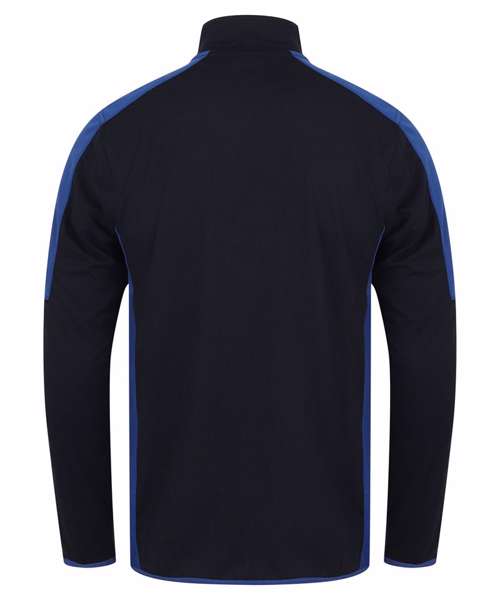 ΒΌ zip style with stand-up collar. Contrast colour/fabric panels at sides and sleeves. Reversed nylon coil zip with lock down zip slider. Contrast colour stretch binding at cuffs and hem, and concealed pocket in panel seam (right-hand-side as worn). Finden & Hales tear-out label for easy rebranding.