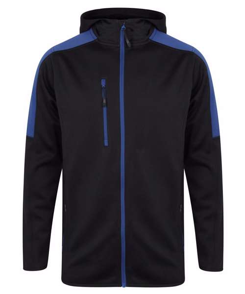 Contemporary softshell jacket with 3 piece hood. Contrast colour panelling on shoulders and upper sleeve. Soft-touch Jersey fabric with bonded microfleece reverse. Zipped chest and side pockets and contrast colour centre front zip with non-slip gripper zip pulls. Side body panels with topstitching. Dropped back hem. Stretch binding at cuffs and hem. Set-in sleeves.
