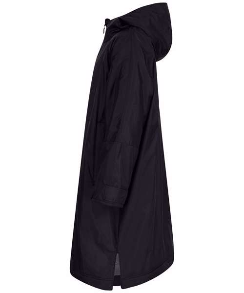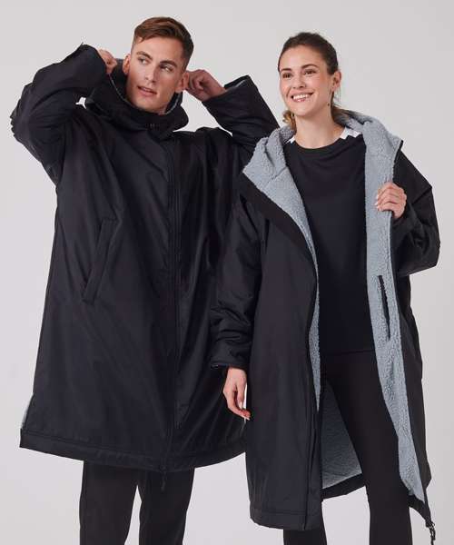 The ultimate team robe is made in a water-resistant fabric with a cosy sherpa fleece lining and three-piece hood. One size fits all, the roomy fit with double-ended full front zip allows wearers to keep warm and get changed underneath the robe. Perfect for wild swimming or wearing on team sidelines. Zipped pockets with fleece lining keep hands warm with multiple inner pockets for keeping belongings safe. Topped off with a large embroidery zip for access to directly decorate.