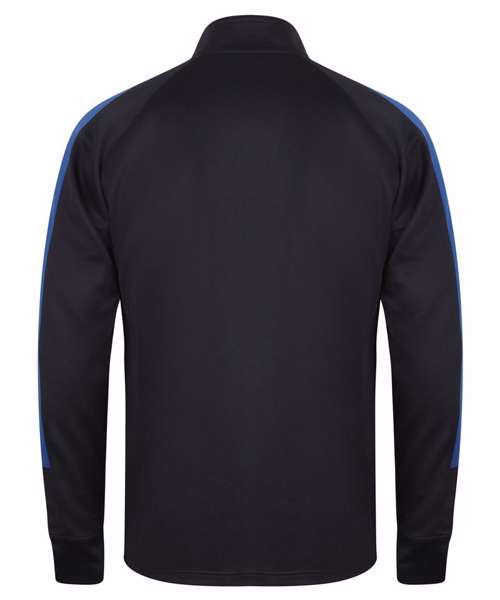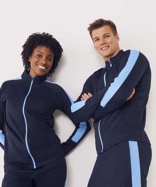 Knitted tracksuit top with contrast colour panels on outer sleeve. Contrast colour centre front zip. Zipped side pockets. Funnel neck and 1x1 ribbed cuffs. Semi-automatic lock zip sliders on all zips.