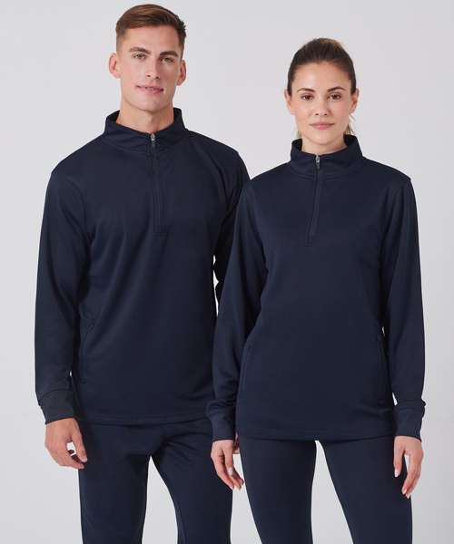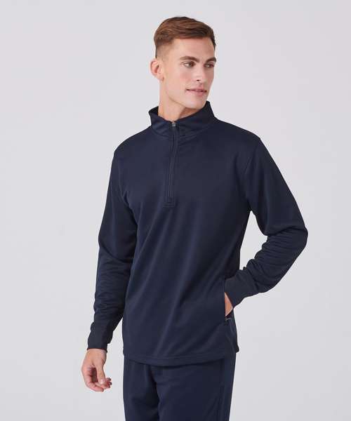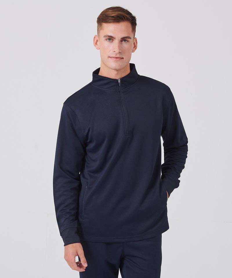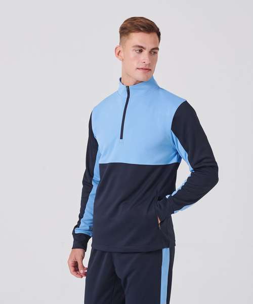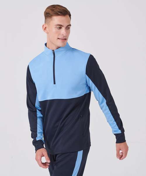 Contrast upper chest and underarm panels. Quarter zip. Side panels. Reverse nylon zips centre front and side pockets. 1x1 ribbed cuff sleeve. Semi-automatic zip pull and slider.