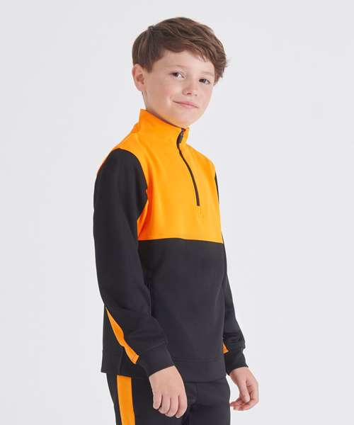 Contrast upper chest and underarm panels. Quarter zip. Side panels. Reverse nylon zips centre front and side pockets. 1x1 ribbed cuff sleeve. Semi-automatic zip pull and slider.