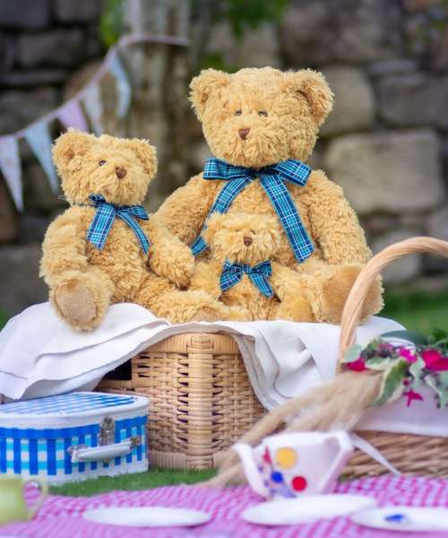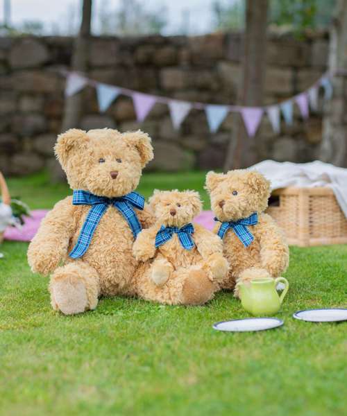 Join the teddy bear's picnic with the Bracken bear, with light brown coloured fur and accessorised with a charming blue tartan ribbon.