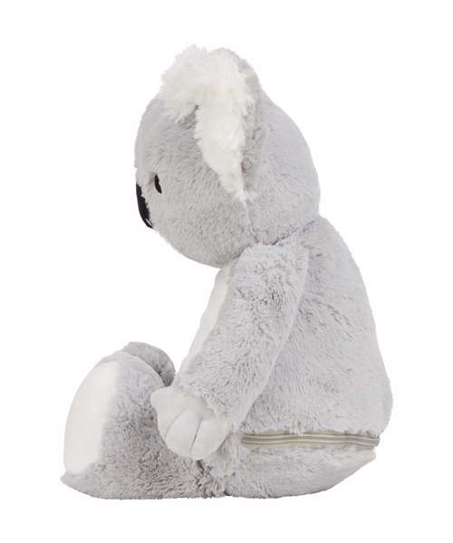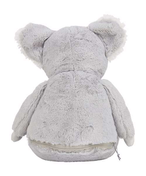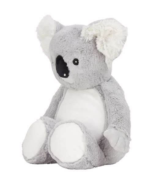 Soft plush Zippie koala bear with contrast nose and inner ears. Sewn eyes and mouth. White panel on tummy, perfect for decoration. Zip access on base for direct access onto the tummy for decoration. Removable inner stuffing. Can be embroidered, vinyl, and sublimation printed. Complies with EN71 European Toy Safety regulations. Remove all hang tags and their fasteners before giving this item to a child. Suitable for all ages.