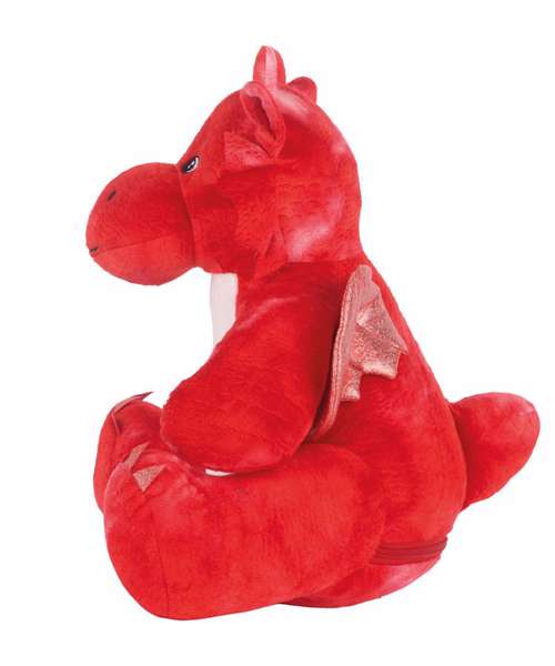 Soft, plush Zippie red dragon with contrast wings and claws. Sewn eyes and mouth. White panel on the tummy, perfect for decoration. Zip access on base provides direct access to the tummy for decoration. Fully removable stuffing, including headpiece. Can be embroidered, DTF, vinyl and sublimation printed. Complies with EN71 European Toy Safety regulations. Remove all hang tags and their fasteners before giving to a child. Suitable for all ages.