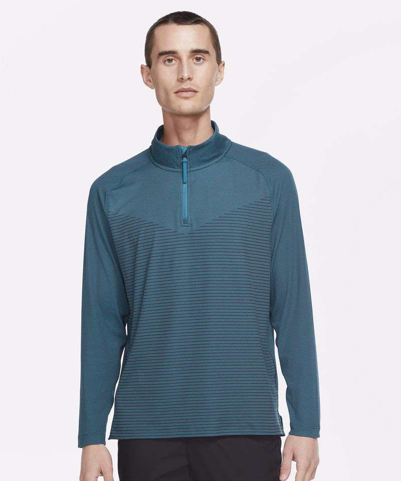 Nike Dri-FIT ADV technology combines moisture-wicking fabric with advanced engineering and features to help you stay dry and comfortable. Raglan sleeves eliminate shoulder seams to increase comfort and reduce fabric bunching through your swing. The hem vents are set at a slight angle so you can easily layer it over a polo or another baselayer. The half-zip lets you vent out extra heat, or it can keep the cold away during chilly tee times. The textured zip pull is easy to grip with a glove on. The zip guard at the top of the collar feels soft and smooth beneath your chin. Standard fit for a relaxed, easy feel.