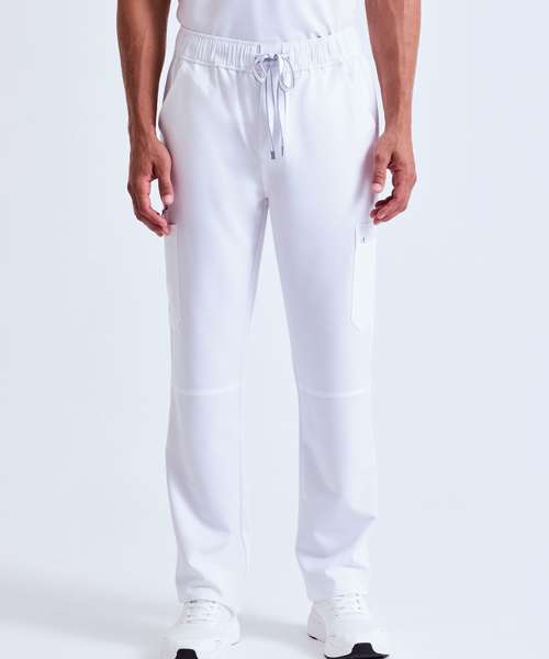 Men’s cargo scrub pants. Comfortable four-way stretch. Breathable, easycare, crease-resistant fabric. Single-button waistband with adjustable drawcord and zip fly. Multiple mobile-friendly coin and zip pockets. Hemmed side vents. Decorate with embroidery and/or print. Contains certified recycled polyester.