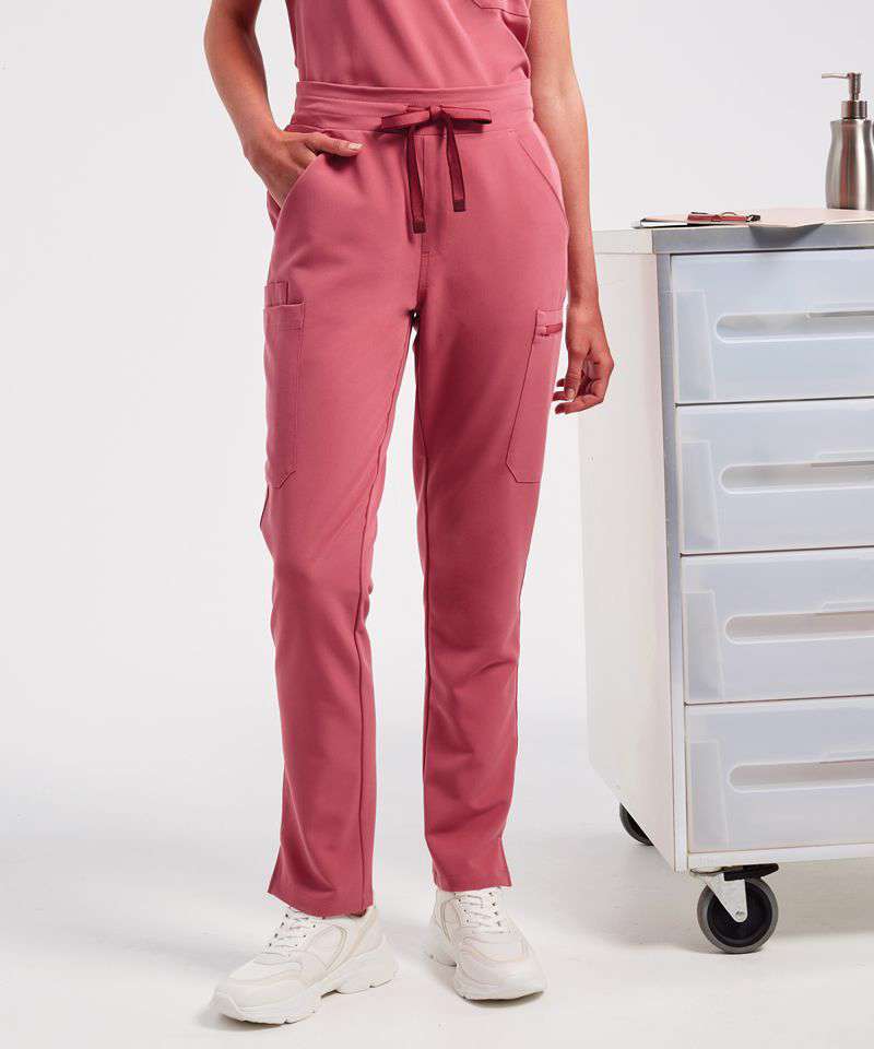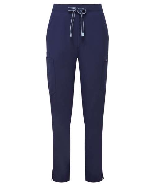 Women’s cargo scrub pants. Comfortable four-way stretch. Breathable, easycare, crease-resistant fabric. Part-elasticated waistband with adjustable drawcord and mock fly. Multiple mobile-friendly coin and zip pockets. Hemmed side vents. Decorate with embroidery and/or print. Contains certified recycled polyester.