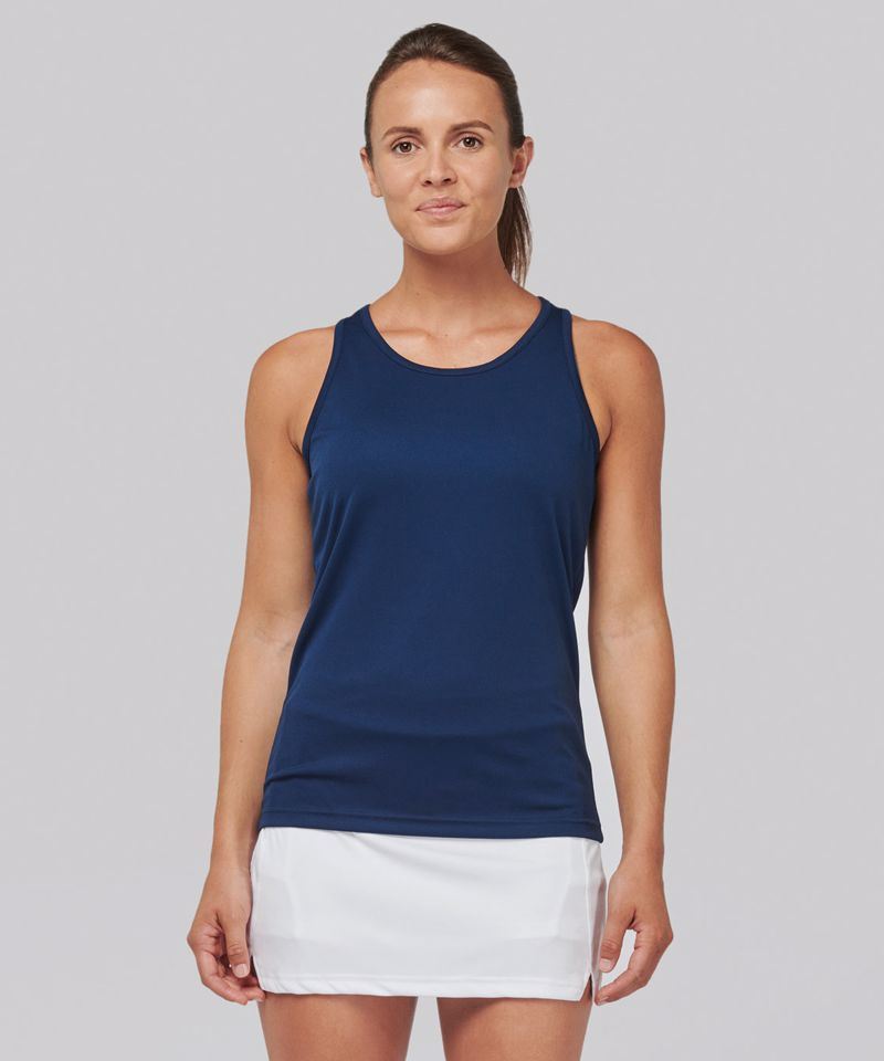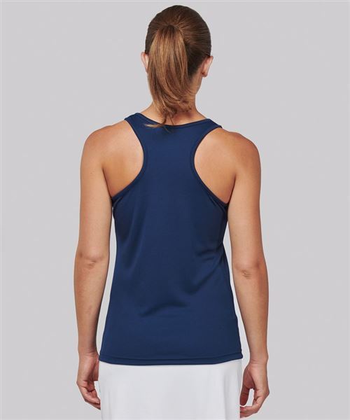 100% polyester. Quick-drying lightweight fabric. Racer back style. Bound neck and armholes. Twin needle finishing at the hem. Certified STANDARD 100 by OEKO-TEX® N° CQ 1007/7, IFTH.