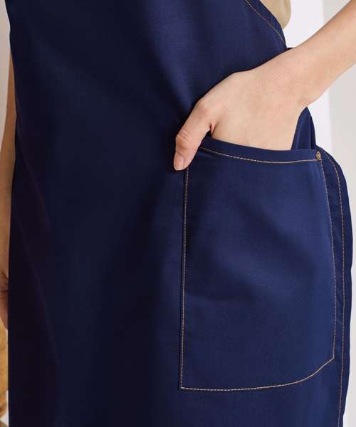 A bib apron, made with a combination of certified recycled polyester and cotton. Featuring two handy side pockets with rivet detail. The centre zip pocket comes away to the underside to allow embroidery applications. Contrast stitching features across this apron and oversized antique brass eyelets give an industrial- chic feel to the design.