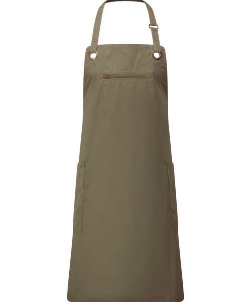 An full bib apron made with a combination of certified recycled polyester cotton. Featuring two handy side pockets with rivet detail. The centre zip pocket comes away to the underside to allow embroidery applications. Contrast stitching features across this apron and oversized antique brass eyelets give an industrial-chic feel to the design. Eyelet and rivet detail. Adjustable antique brass buckle on neckband. Side pockets and centre zipped pocket.
