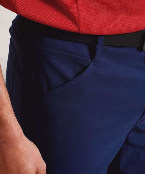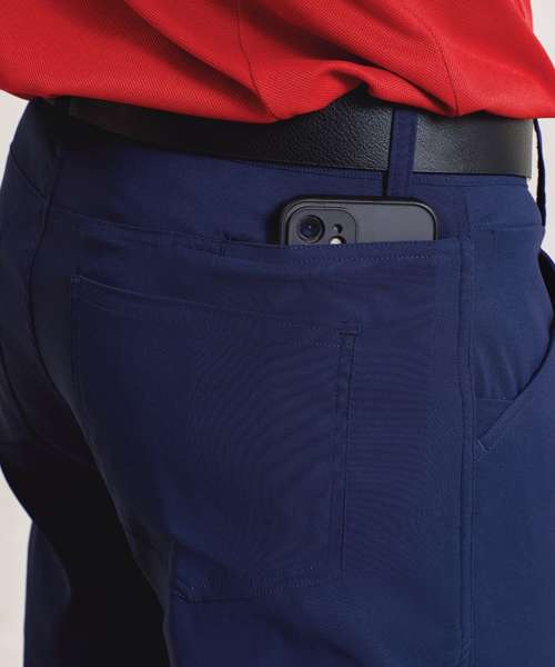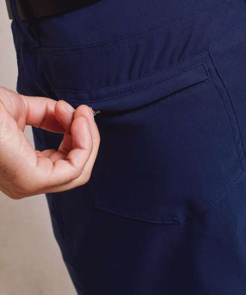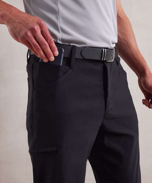 Trousers in stretch fabric for absolute comfort. Nylon/elastane blend for durability. Hidden elasticated waistband with single-button fastening. Belt loops. Covered zip fly. Reinforced side pockets with inner mobile phone pocket. Zipped welt pocket on the right leg. Zipped welt pocket and mitred patch pocket to the reverse. Available in regular leg 31"/79cm and long leg 34"/86cm.