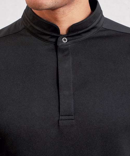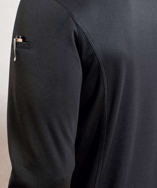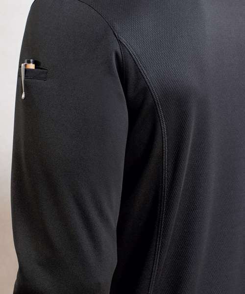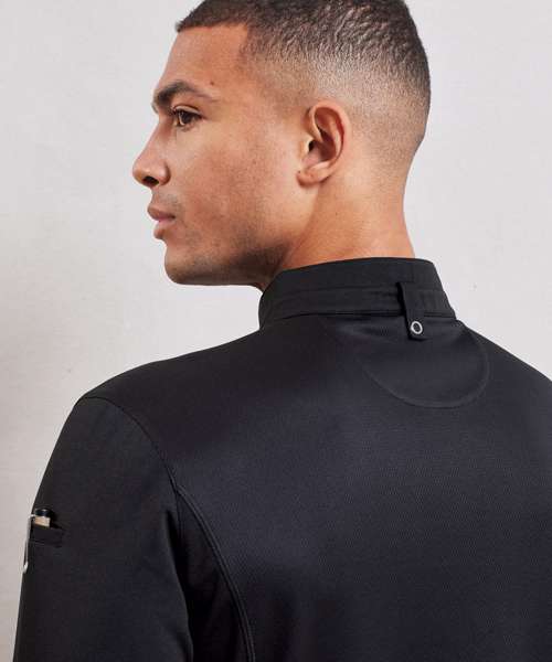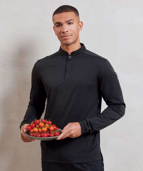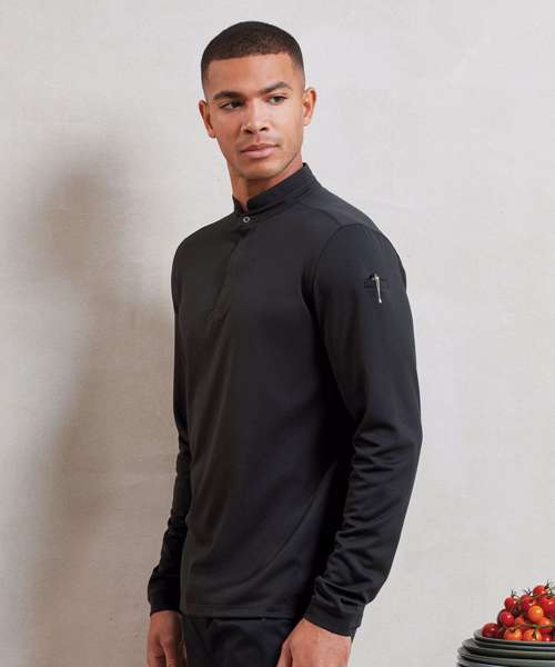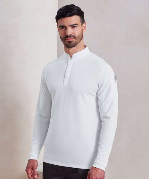 Long sleeve shirt in Premier’s moisture-wicking, breathable Coolchecker® fabric. Mesh back panel provides ventilation and airflow. Banded neckband with single press-stud button. Mandarin collar stand. Covered placket with two press-stud buttons. Press-stud button to the reverse to hold an apron in place on the neckband. Pen pocket on the upper left sleeve. Ribbed-knit cuff for a neat finish on the wrist. Slide slits on the hemline. Made with 100% certified recycled polyester.