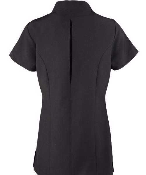 Beauty and spa tunic with feature button front fastening with concealed zip. Mandarin collar. Short sleeve. Princess seams. Side vents. Back pleat for ease of movement. Easycare.