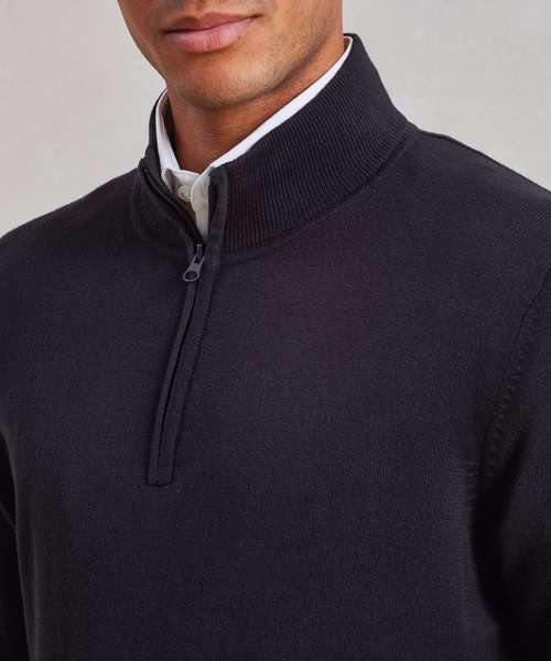 ¼ zip through collar fastening. Cotton rich yarn for a soft feel. Fine gauge knit. Set in sleeve with a ribbed knit cuffs and ribbed hem for fitted styling.