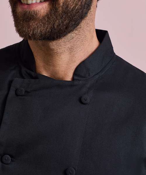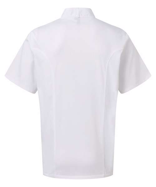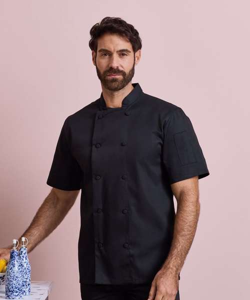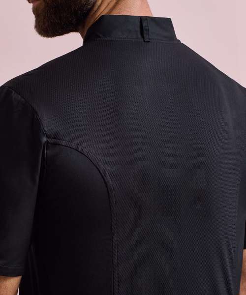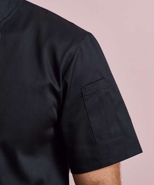A short sleeve chef's jacket constructed with our very own Coolchecker® fabric. The centre back panel is made from the Coolchecker® fabric which offers exceptional moisture management and wicking properties so chef stays fresh and cool during service. A wrap over fastening with ten self-fabric buttons with a mandarin collar and a useful double pen pocket on the left arm.
