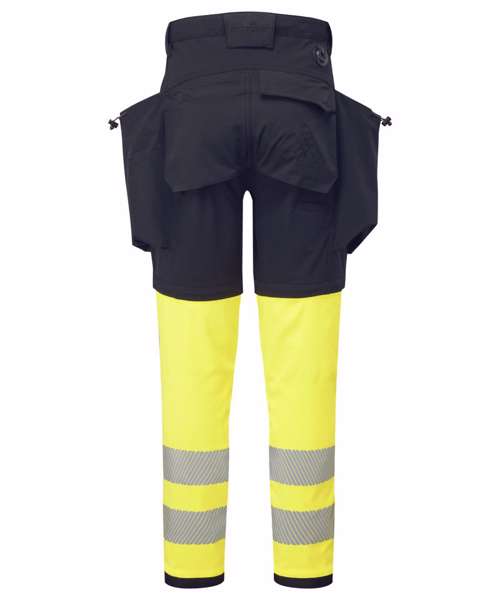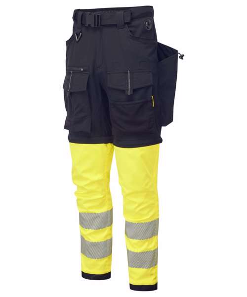 The Ultimate modular 3-in-1 trouser design for your every need. The 3-in-1 design converts a work trouser to a work short or a EN20471 Class 1 work trouser. You have every thing you need. Pockets with magnetic flaps so they don't get in the way, kneepads pockets, large built-in side pockets for large tools, spray cans or just fold up the legs when in shorts mode and keep them safe. Built-in waistband, front of leg cargo pocket for easier use when working, with a mesh mobile phone pocket. Plus the unique clip on pocket system with the use of three pockets that can clip on the front or the back of the trouser.