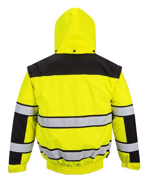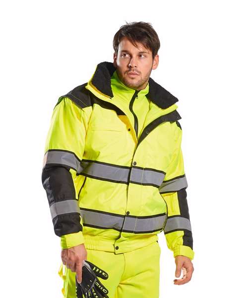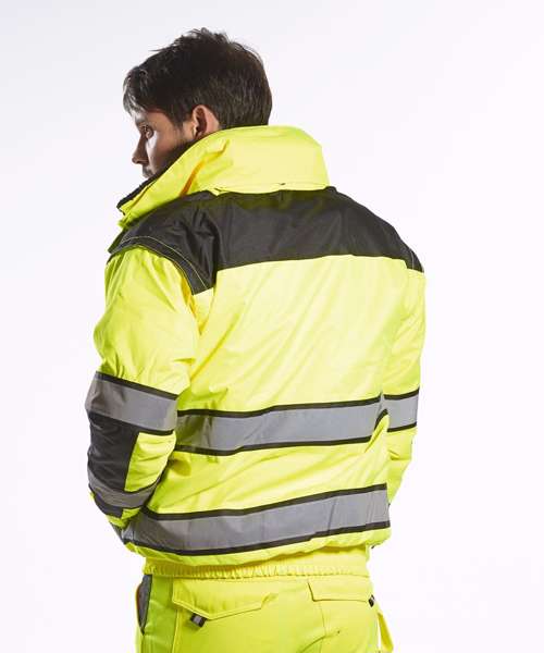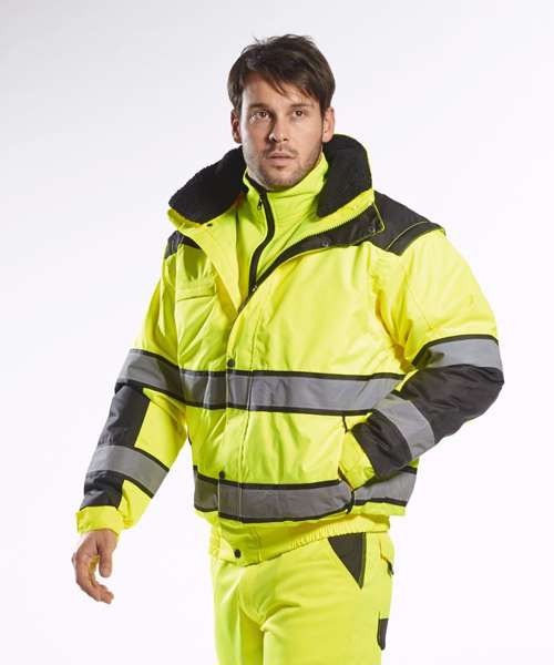 Extremely water resistant PFAS free Texpelâ„¢ Splash Eco fabric finish, water beads away from fabric surface. Stand out from the crowd with this classic bomber jacket. It features a detachable fur liner, removable sleeves and detachable collar making it adaptable to all weather conditions. Other features include ID pocket, security sleeve pocket and contrast back panels. Conforms to EN ISO 20471 Class 3, EN 343:2019 Class 3:1 X WP 15000mm EN342 0.344 (M2.K/W), 2, X.