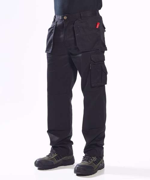 This rugged trouser is a fantastic addition to the Kit Solutions range. Constructed using our 300g Kingsmill fabric the Slate Trouser offers extra strength and abrasion resistance. Winning features include tuck away holster pockets knee pad pockets hammer loop and low profile branding. The mobile phone pocket is lined with anti shock fabric and will accommodate new smart phone dimensions.