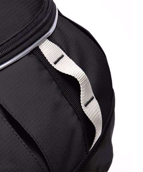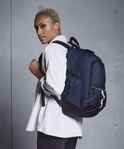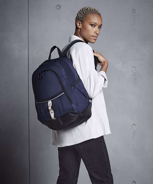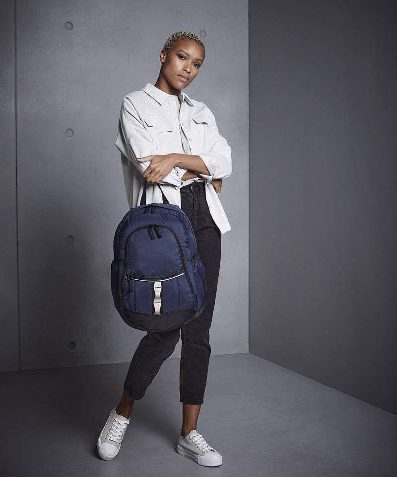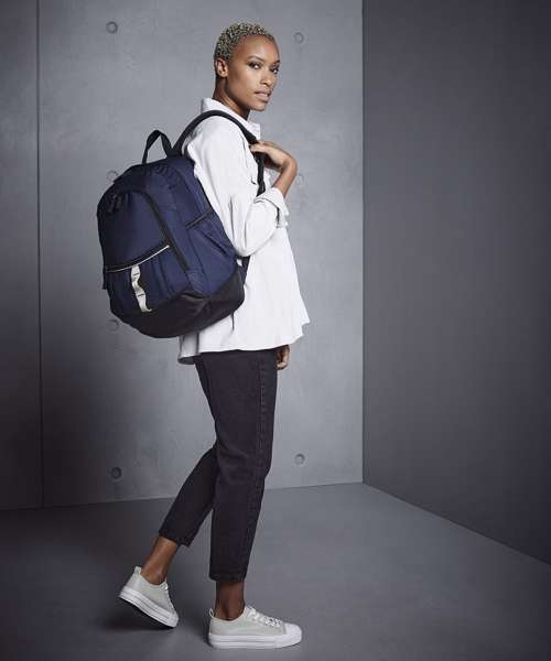 Padded adjustable shoulder straps. Ergonomic padded back panel. Media pocket and headphone port. Front pocket organiser section. Zippered small front pocket. Reflective strip. Grab handle. Elasticated side pockets.