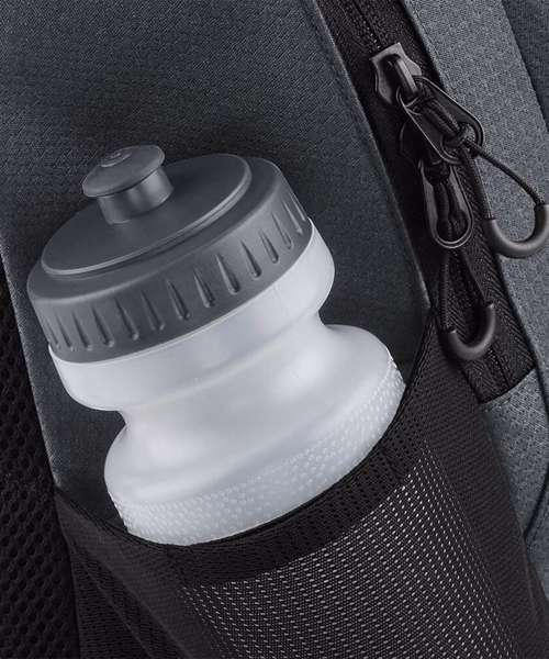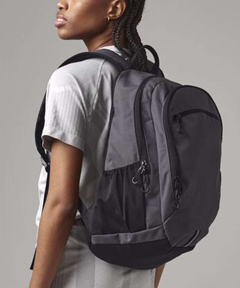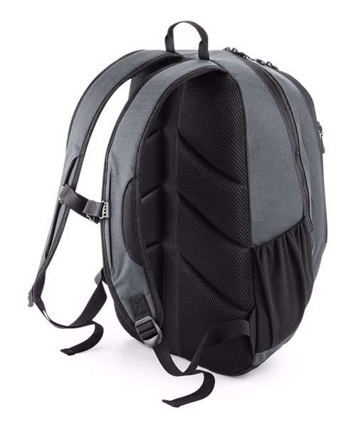 TearAway label for ease of rebranding. Laptop compatible up to 15.6". Dual compartment design. Padded laptop compartment. Reflective accents. Two mesh pockets/ water bottle holders. Zippered front pocket. Internal mesh pocket. Ergonomic padded back panel. Padded adjustable mesh shoulder straps. Adjustable chest straps. Grab handle. Reach certified.
