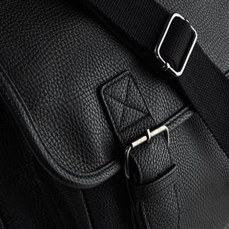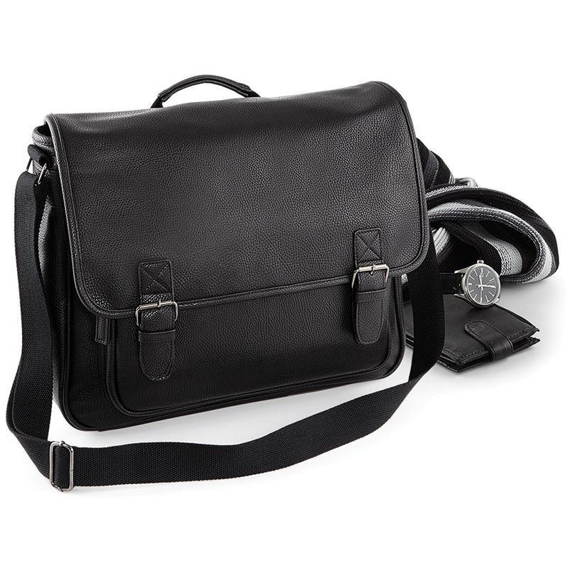 Quality full grain leather look PU. Fully lined in pinstriped fabric. Zippered rear plush lined media pocket. Gunmetal fittings. Zippered front pocket. Magnetic closures. Adjustable shoulder strap. Padded grab handle. Vintage style metal fittings. Reach certified.