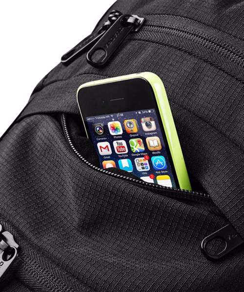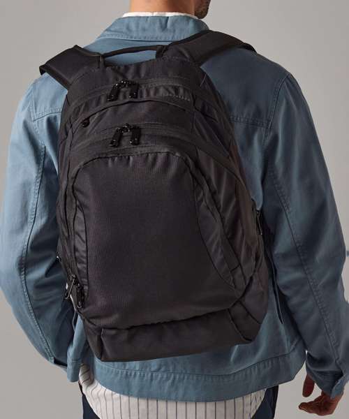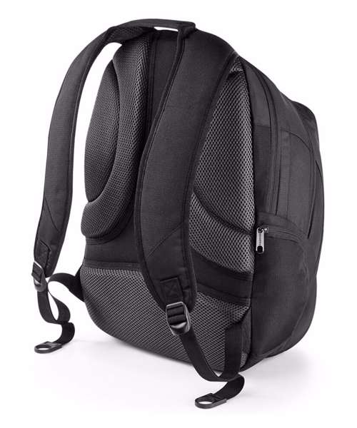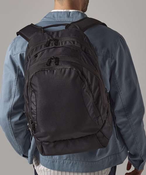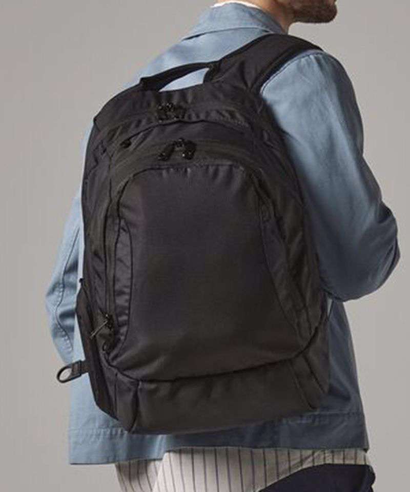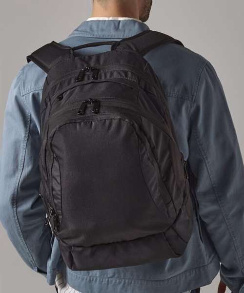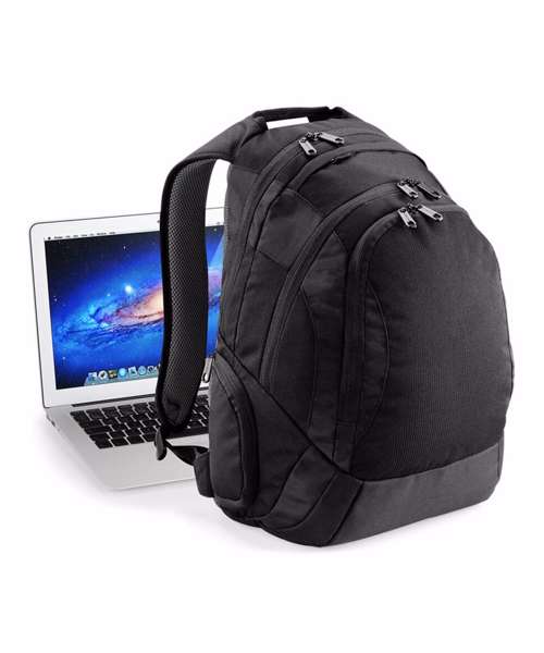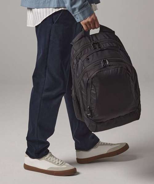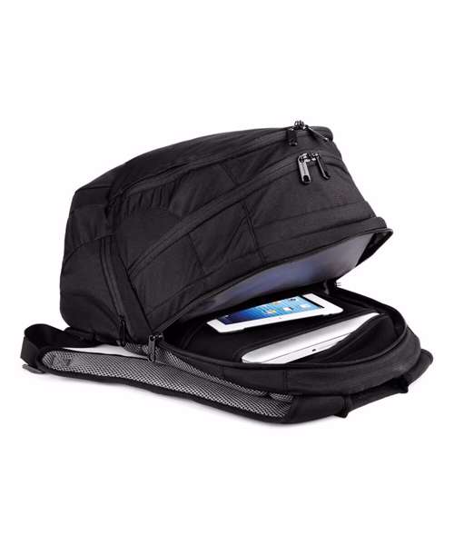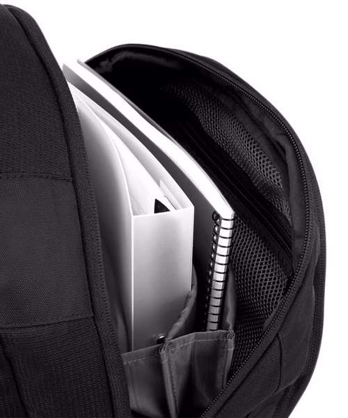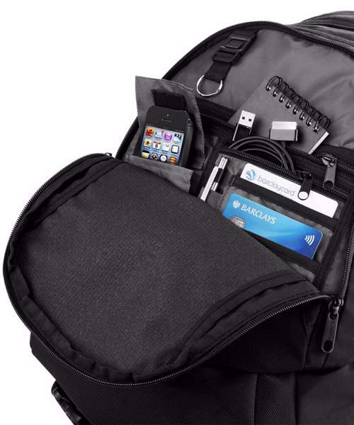 Laptop compatible up to 15.6". Padded laptop compartment. Multiple internal pockets. Padded adjustable shoulder straps. Front pocket organiser section. Ergonomic padded back panel. Document section. Plush lined media pocket with secure closure. Media pocket and headphone port. Zippered side pockets.