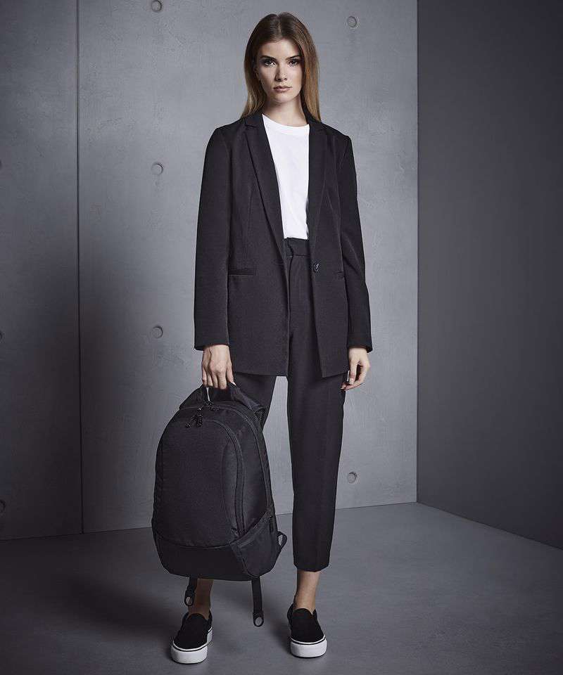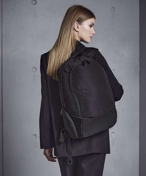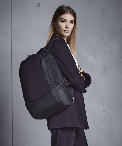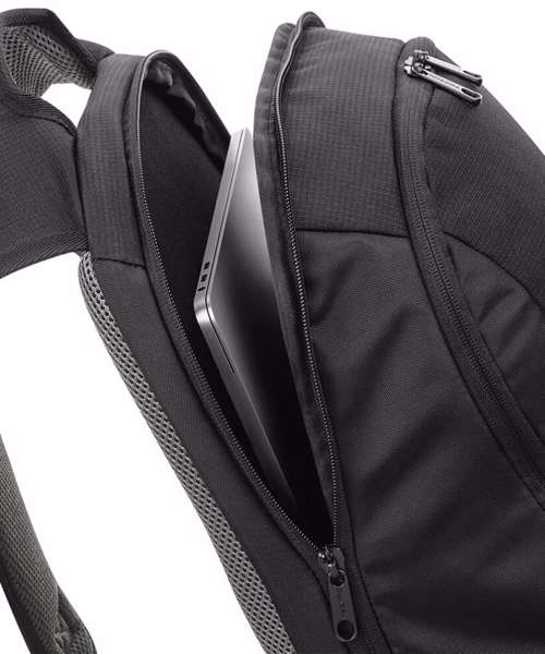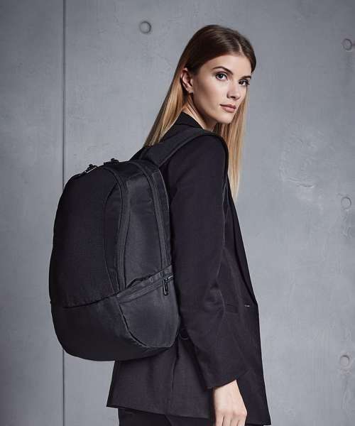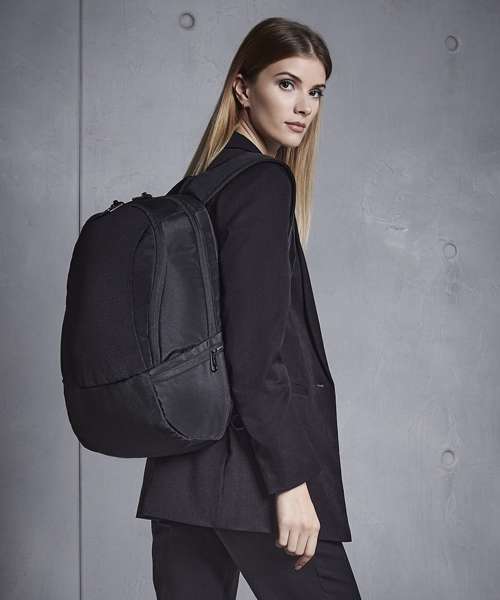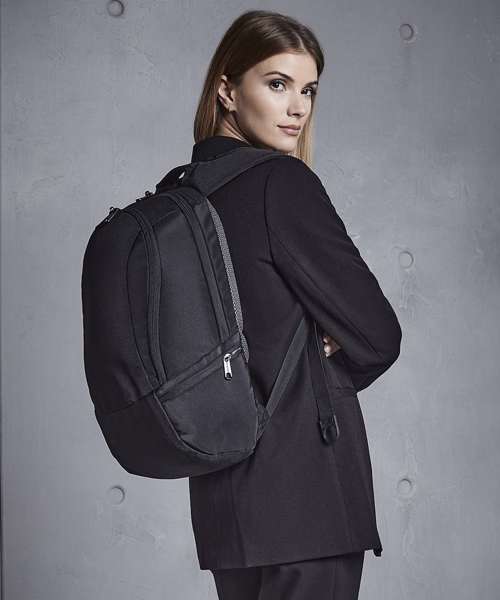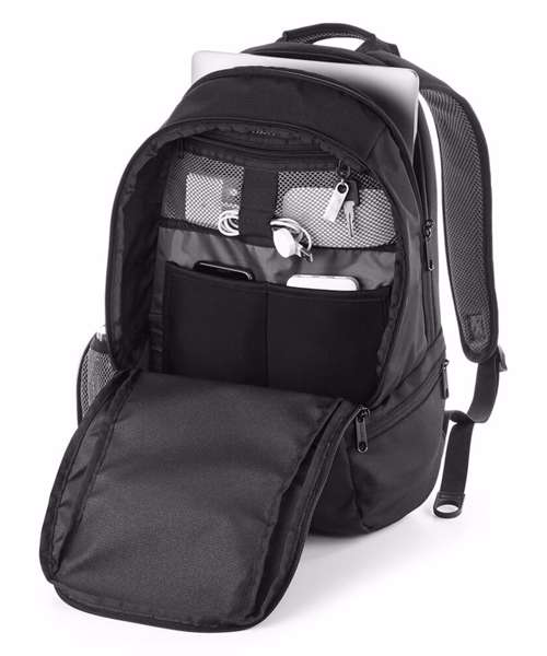 TearAway label for ease of rebranding. External access padded laptop compartment. Plush lined laptop pocket. Laptop compatible up to 15.6". Elasticated cable organiser. Key hook. Internal organiser section. Zippered internal valuables pocket. Zippered side pockets. Lockable zip pullers. Ergonomic padded back panel. Padded adjustable shoulder straps.