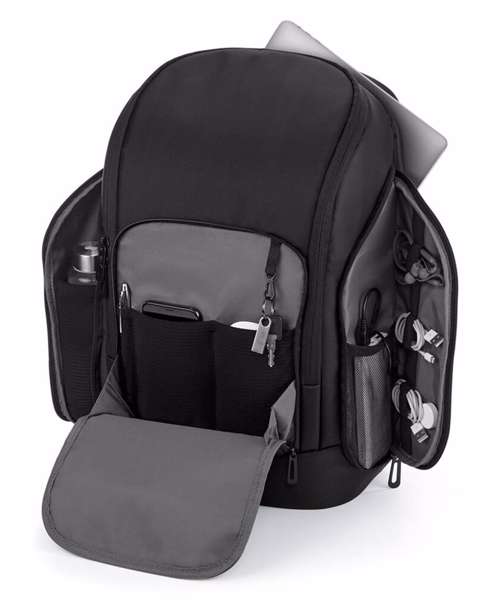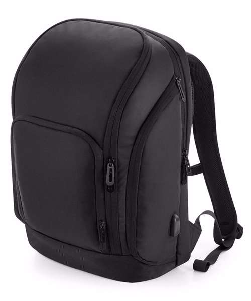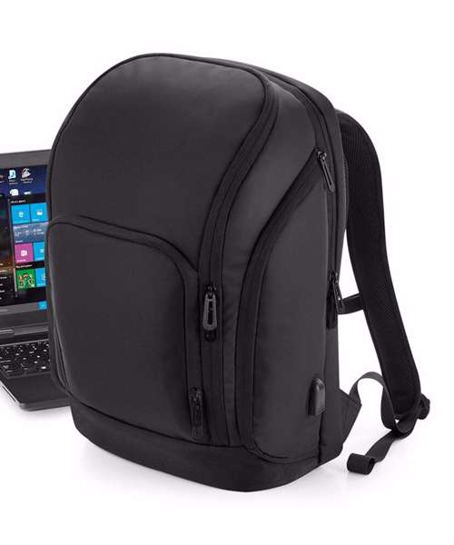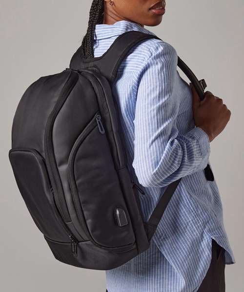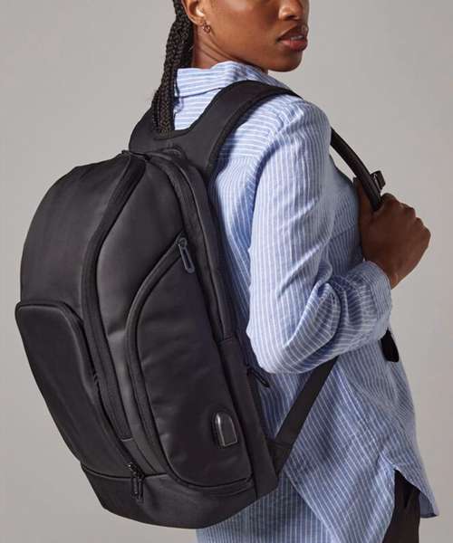 TearAway label for ease of rebranding. Laptop compatible up to 17". External access padded laptop compartment. Padded internal iPad / Tablet compartment. Discrete zippered back panel pocket. Front pocket organiser section. Power bank pocket. Integrated USB charging port. Elasticated cable organiser. Key hook. Zippered internal valuables pocket. Zippered side bottle pocket. Fully adjustable chest strap. Large capacity. Wheelie bag strap. Ergonomic padded back panel. Padded adjustable shoulder straps.