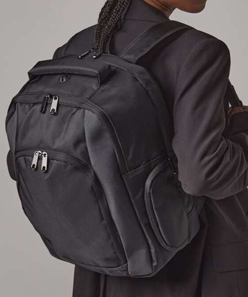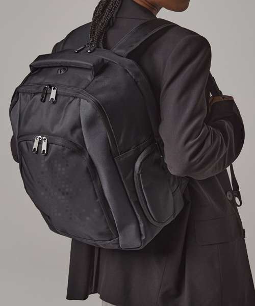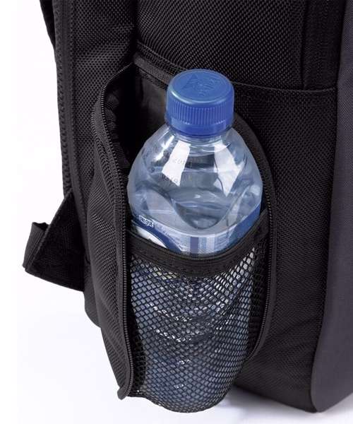 Media pocket and headphone port. Padded laptop compartment. Laptop compatible up to 15.6". Padded adjustable shoulder straps. Front pocket organiser section, side zippered pockets, and water bottle holder. Grab handle.