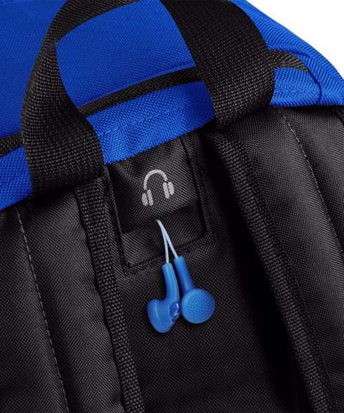 Wet pocket/match ball pocket. Zippered side pocket. Elasticated mesh side pocket. Plush lined media pocket and headphone port. Padded adjustable shoulder straps. Padded back panel. Grab handle.