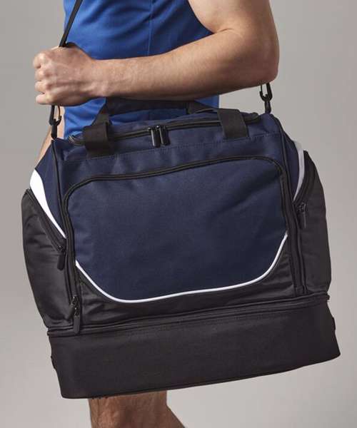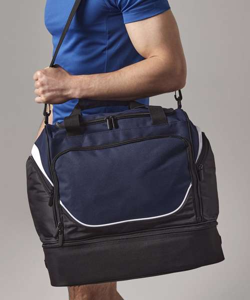 Designed to fit most lockers. Dual compartment design. Structured, ventilated base compartment. Front pocket designed for easy decoration. Zippered end pockets. Internal valuables pocket. Internal mesh pockets. Detachable adjustable shoulder strap with pad. Padded hand grip. Protective base feet.