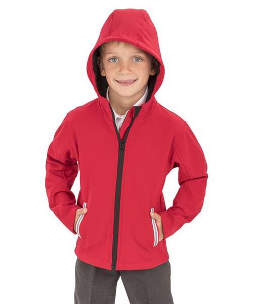 Great design and function for this 3-layer children's softshell jacket microfleece inner for extra warmth It also benefits from a full integral hood for added cold weather protection. Durable water-repellent finish, breathable, and windproof.