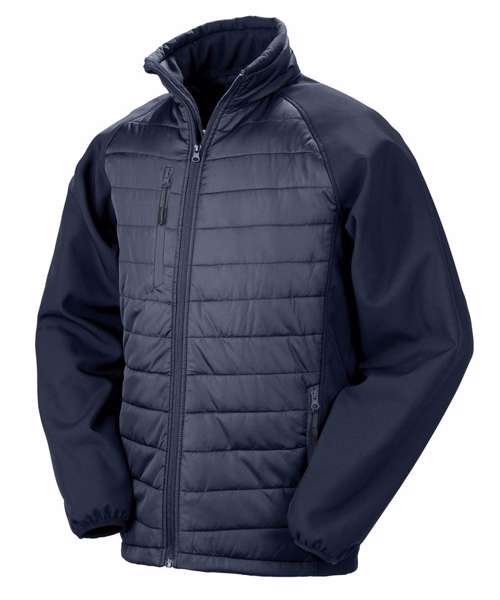 On-trend padded plus softshell combination. Supersoft, lightweight and warm. Printable softshell sleeves. Ready to brand. Quiet to wear. Contrast colour pocket zips. Full front zip with chin guard. Stand-up padded collar. Padded body. Soft bound cuff. Black zip pulls. Contains recycled polyester.