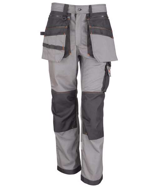 These super tough, heavyweight work trousers bring style and performance to a new level. Cordura knee panels and hem add scuff resistance while the reflective tapes add a touch of safety. Removable holster pockets, D-ring and bellowed rear cargo pockets create functionality to the new king of the work trouser!