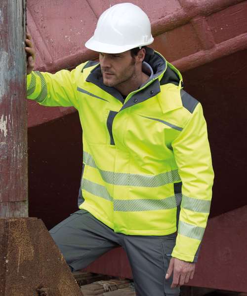 The new generation in safety wear! This 3-layer performance dynamic softshell brings style, fit and comfort. The durable water-repellent fabrics, breathability, inner storm cuffs and hood all add to the windproof protection whilst the modern printed chevron design brings the EN ISO 20471 Class 2 visibility that allow this beautiful jacket to stand out from the crowd!