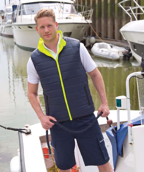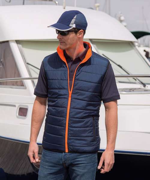 EN ISO 20471:2013+A1:2016 CLASS 2; RIS-3279-TOM (ORANGE ONLY). Lightweight and warm. Soft stretch. Printable. High visibility. Reflective safety body bands. Hang tag. Dark lower panel masks grime. Soft bound cuff. Stand-up collar. Quiet to wear. Zipped pockets. Ready to brand tag free. Decorating methods: Embroidery. Decorators access point: Hidden chest and back zips on navy side.