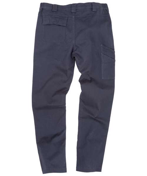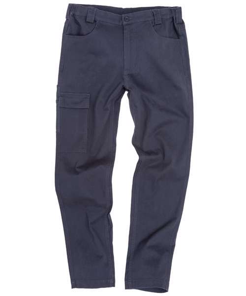 Peach finish slim-fit stretch chino trousers. Rear, hip and cargo pockets. YKK zip with button fastening. Critical bar tack. Twin-needle seams. Expansion waistband for adjustable fit and draught protection. Hardwearing finish.